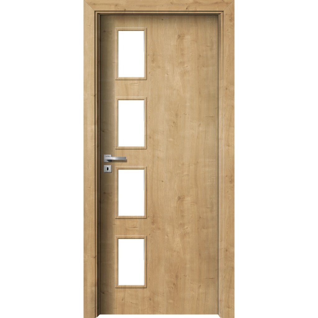 Model dverí s obdĺžnikovými prvkami presklenia v jednom rade nad sebou pri kľučke. Zasklenie je realizované pomocou rôznych ornamentných skiel podľa aktuálnej ponuky. Sklo možno nahradiť plnou kazetou, ktorú môžete ľubovoľne kombinovať a zvoliť si tak mieru presklenia, ktorá Vám vyhovuje.