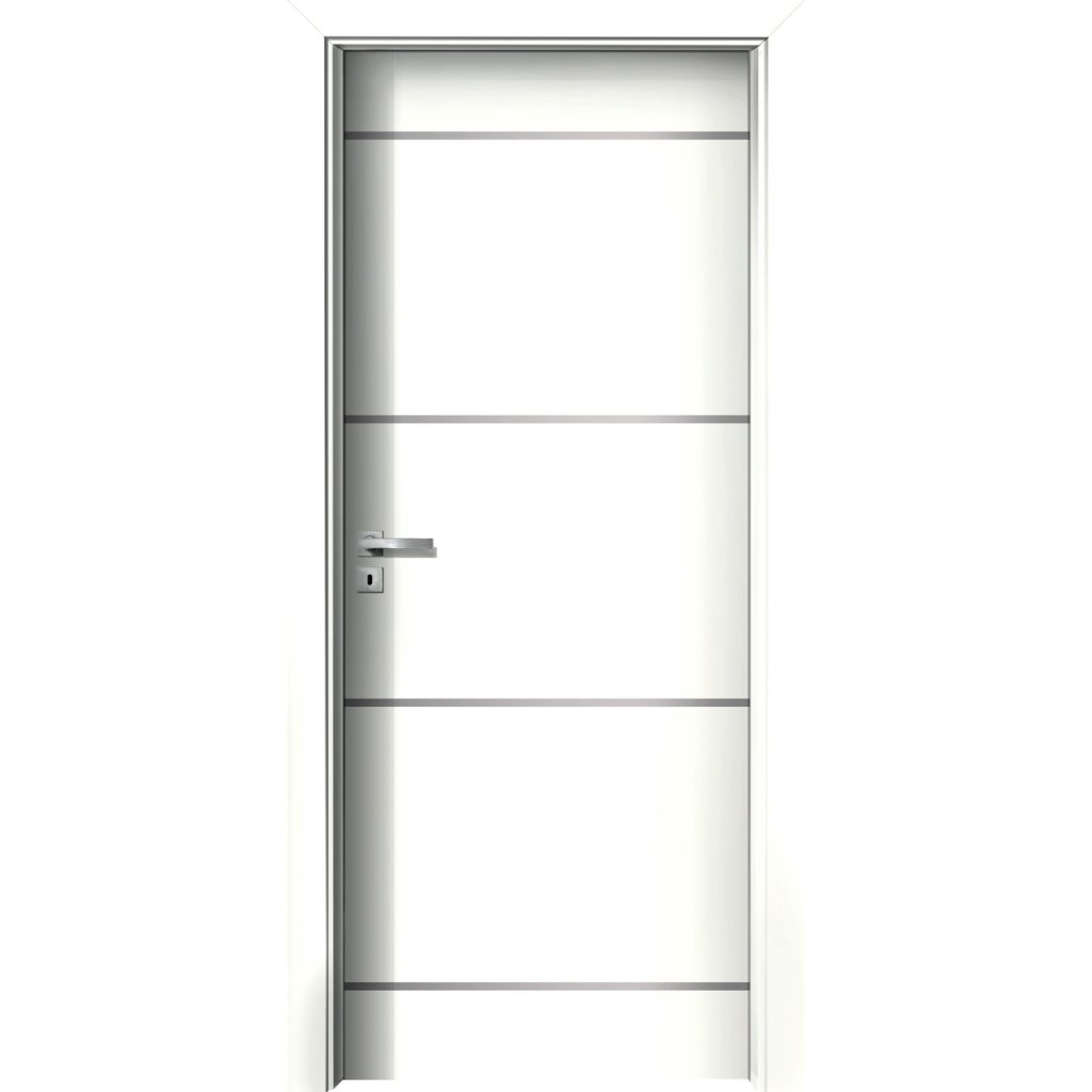Model dverí s charakteristickými vodorovnými hliníkovými prúžkami, ktoré sú zapustené v celej ploche dverí. Tento model dverí s jednoduchými ozdobnými kovovými prvkami a luxusným vzhľadom sa hodí do každého moderného interiéru.